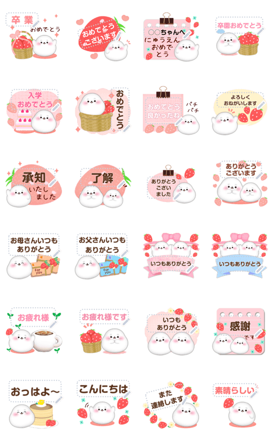 | スタンプ説明 | 【アザラシ】ほんわか/苺/春/好きな文字を入力/メッセージスタンプ/挨拶に使えるスタンプ/敬語/母の日/父の日/ご結婚おめでとうございます/お大事に/了解/mamama-chin 現在この商品は一部のスマートフォン版LINE 10.3.0以上のトークルームでのみ使用できます。動作環境の最新情報はヘルプをご確認ください。 |