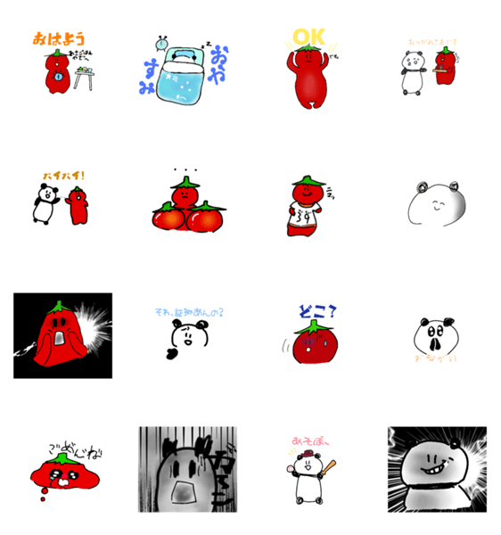このスタンプは、トメトと、ペンダを中心に制作しました。ペンダは、パンダに似ていてトメトはトマトに似ています。