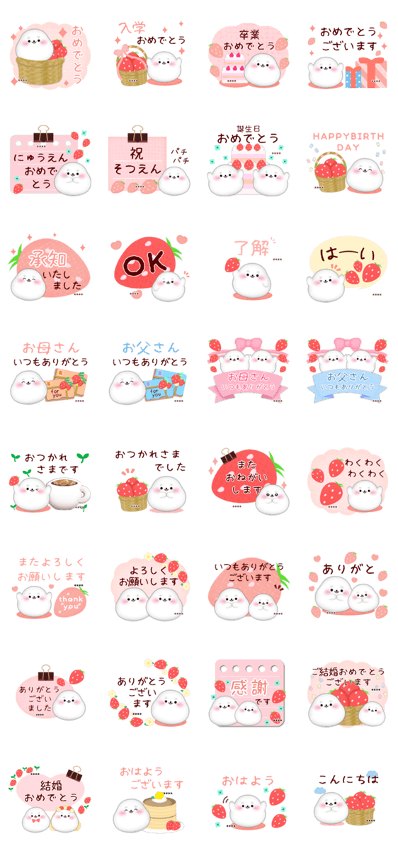 【アザラシ】名前を入力できる/苺/春/ありがとう・おめでとうスタンプ/挨拶に使えるスタンプ/敬語/母の日/父の日/ご結婚おめでとうございます/お大事に/了解/mamama-chin