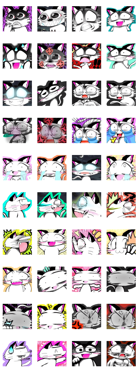 猫のマンガ風なスタンプです。カワイイのや、面白いの、変な顔など色々揃ってます