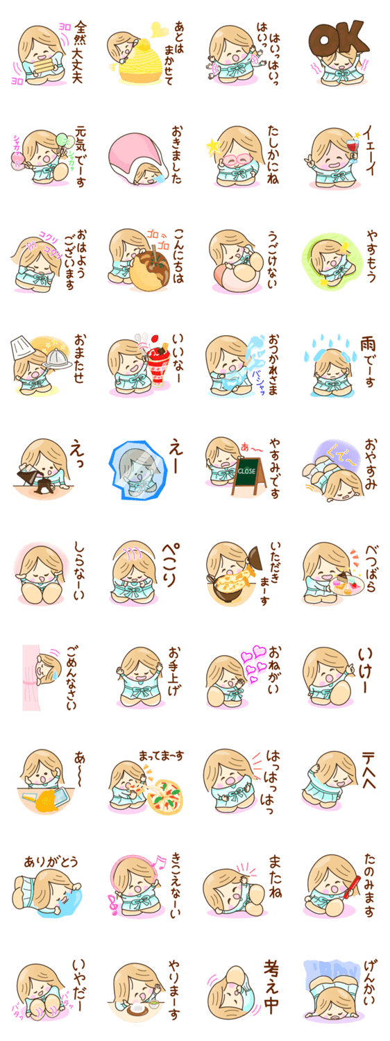 日常でつかいやすい笑顔で元気なたのしいスタンプです。 元気でーす/たしかにね/やすみです/うごけない/べつばら/お手上げ/おねがい/考え中/げんかい