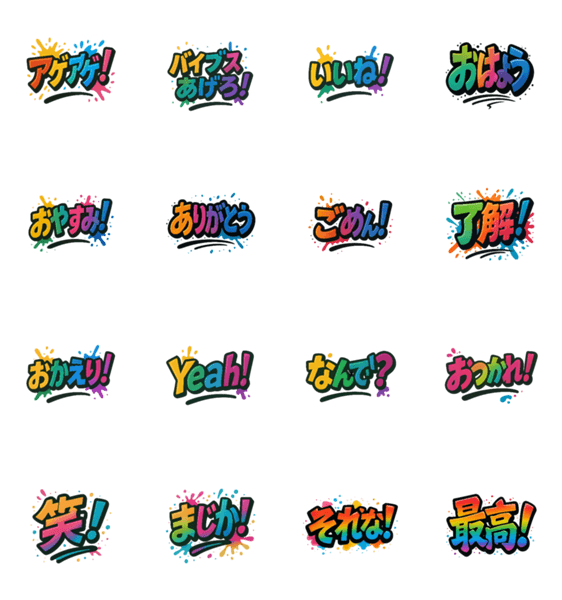 カラフルでポップなグラフィティ風スタンプ 「アゲアゲ!」「おはよう」「最高!」など、日常会話もテンション爆上げ! ヒップホップな気分でリアクションしよう