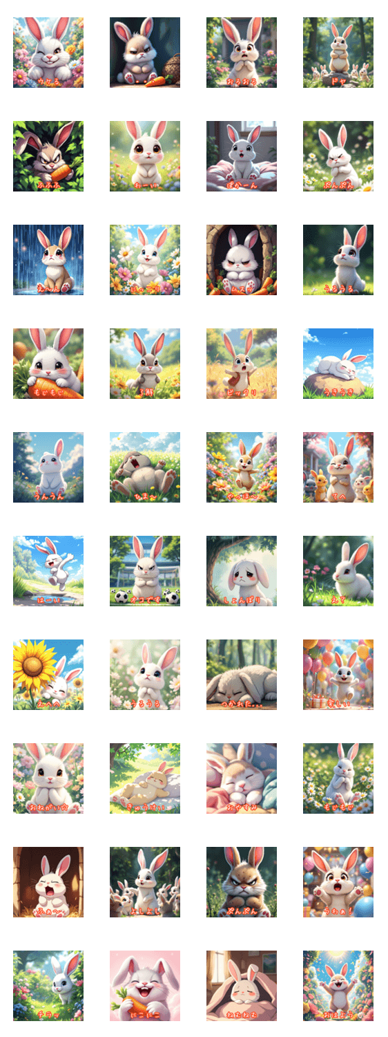表情豊かなウサギのアニメ風スタンプが登場!日常会話に使いやすく、かわいさ満点。気持ちをふんわり伝えよう!