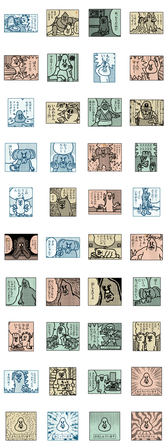 昭和のマンガのような、誰もがなんだかどこかで 見たことがあるような雰囲気のゆかいなスタンプです。ぽろっこー!