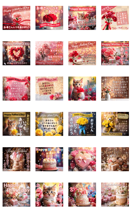 母の日、父の日、誕生日の飛び出すキラキラ豪華なポップアップスタンプです。おめでとう、記念日、結婚祝いetc. #猫 #テディベア #カーネーション #薔薇