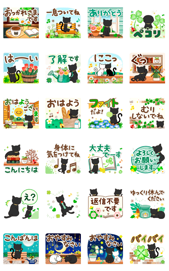 新緑の季節にぴったりの黒猫のシルエットとグリーンのキラキラしたデザインです。グリーンと猫ちゃんのヒーリング効果で癒される、大文字の毎日使える挨拶スタンプです。