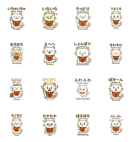 幸運のシンボル・招き猫の「まねにゃん」が、感情をユーモラスに表現した和風オノマトペスタンプ。日常のやりとりにぴったり!