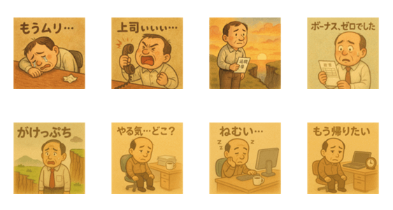 崖っぷちおじさんの日常スタンプです。 可愛くて愛おしいおじさんを応援してください