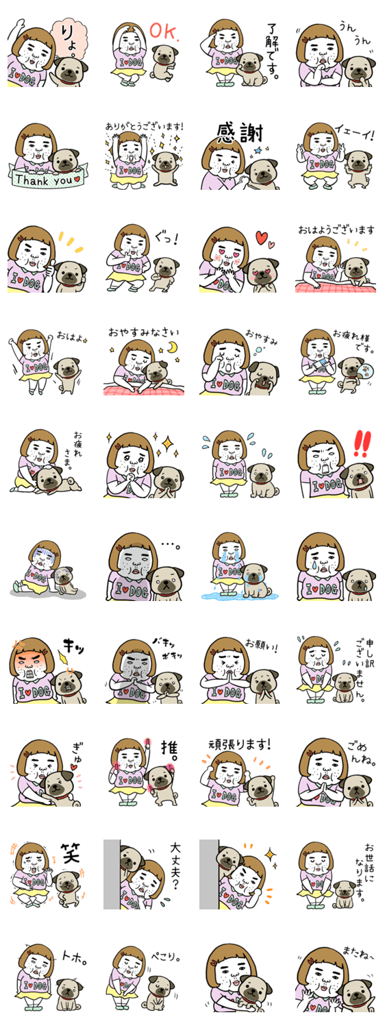 憎めないブスとかわいいパグの子犬スタンプです。日常会話や挨拶には勿論、恋人友達家族や仕事仲間に!ブサイクだけど愛嬌がある自虐大人女子ネタスタンプ!毎日使えるよ!
