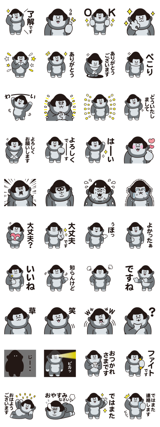 毎日使えるオカッパのゴリラのスタンプです。マッスル返信、みんなの変顔、しろめ爆弾、おかっぱパグ、少しうざい短文スタンプ、微妙にうざいシリーズのスタンプ69作