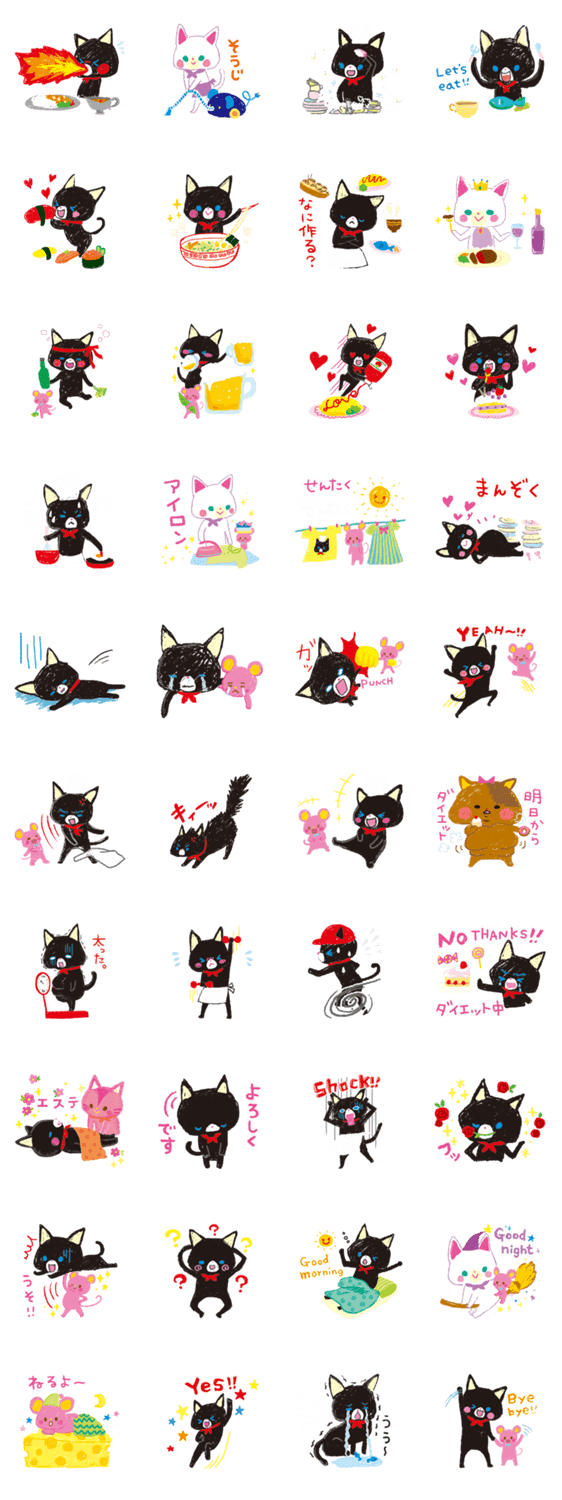 そうじ、洗濯、料理にダイエットまで、お手伝い大好きな見習いコックの黒猫ペコと白猫リンが頑張る日常スタンプ!今日のご飯何食べようか?猫達と一緒に考えよう!