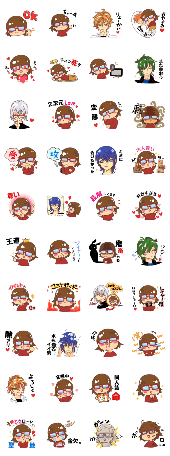 ボーイズラブ好きな腐女子のためのスタンプ。仲間とのトークをより有意義に!アニメやマンガは好きですか?同人、コミケ、イベント好き、コスプレイヤーも必見です!