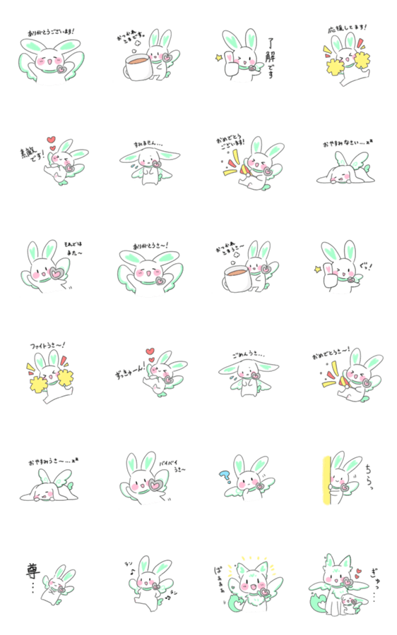 背中の羽で空を飛ぶ不思議なうさぎ「ラン」のスタンプです。 使いやすい敬語と、ランが使う「うさ語」の二種類を用意しましたので、状況に応じて使い分けてください。