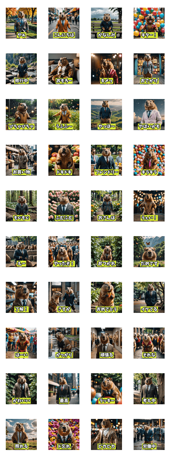今日もスーツでキメてる!?感情豊かなカピバラが、あなたのトークにじわじわユーモアを注入!日常にも仕事にも使える便利スタンプ!