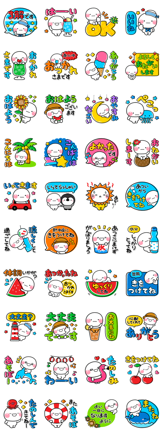 カラフルでポップな大人可愛い日常に使えるスタンプです。今後の夏にもずっと使える内容を揃えましたのでスタンプ初心者の方にもオススメです。【作:いしいともこ】