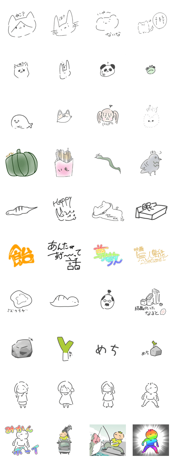 岩さんの描いたはっぴーなイラストが詰まったスタンプです。 私の絵もおまけ(半分)で入っています。 ぜひお友達と楽しんでください!
