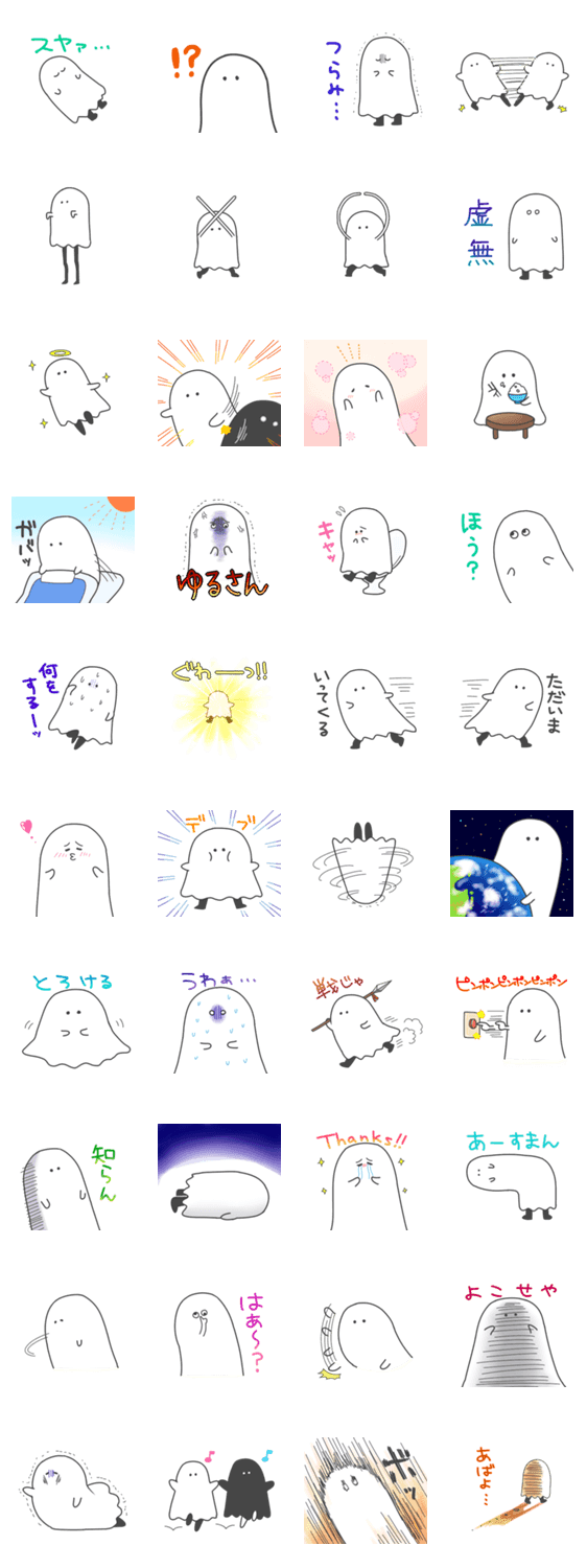 ちょっぴりシュールでかわいいおばけのスタンプです