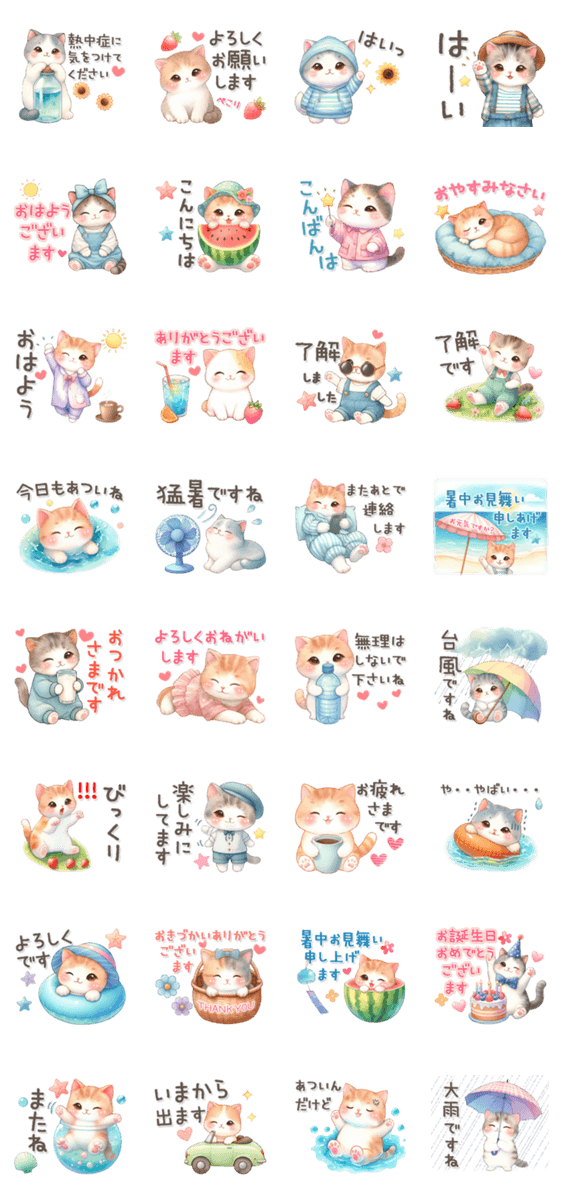 猫好きな方必見!毎日使える可愛い猫のスタンプです☆よく使う基本の言葉を集めました。挨拶や敬語など日常会話に使いやすい!夏向けの元気カラーが大人可愛い♡♯猫の日