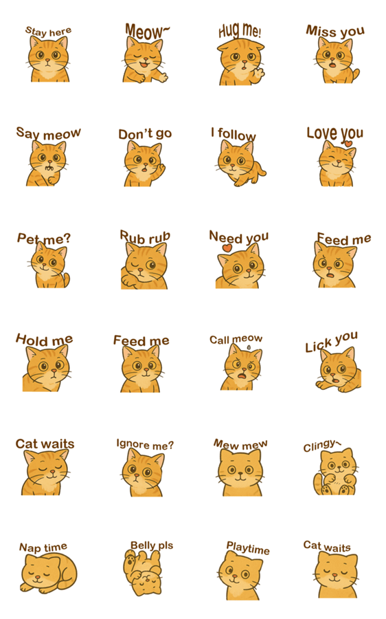 一番の甘えん坊、オレンジ猫のドドがあなたにべったり!毎日のトークにぴったりのスタンプです。
