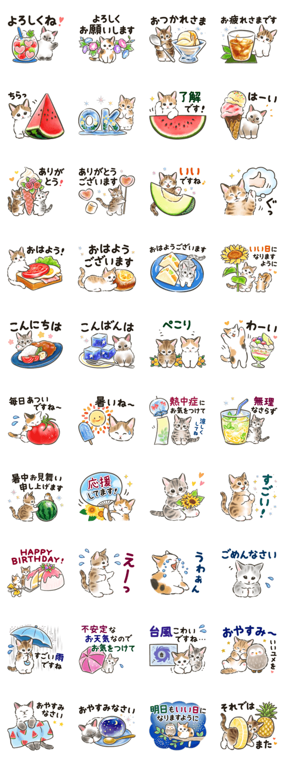 夏に使える表現が満載♪かわいい猫たちのスタンプです。(敬語/挨拶/暑中見舞い/台風/天気/雨)