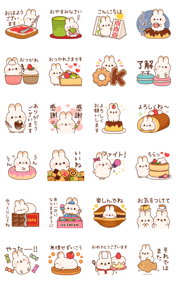 いつでも傍で寄り添って癒しをくれるうさぎさんのスタンプ第八段!美味しそうで可愛いスイーツがたくさん入った飛び出すスタンプです♪