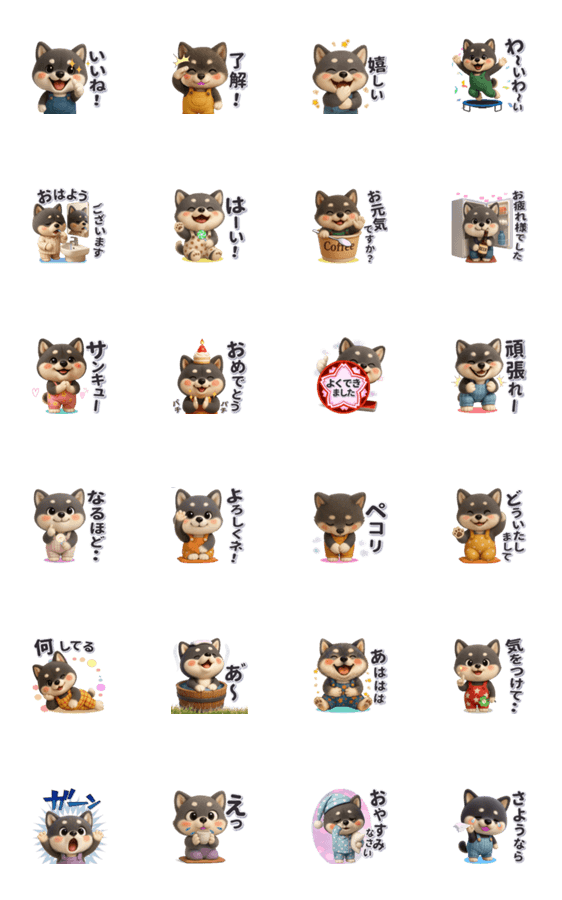 黒柴犬がお茶目な表情から感謝の気持ちまで、あなたの気持ちをキュートに伝えます。トークを盛り上げたいあなたにぴったり!今すぐチェックして、癒やしと笑顔を届けよう!