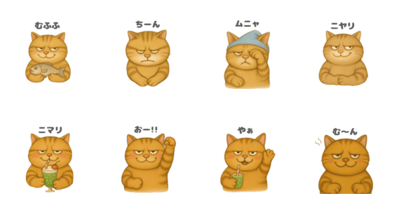 ブサかわいい「茶トラ猫さん」の便利な「おのまとぺ』スタンプ8種類。「むふふ」「ちーん」「ムニャ」「ニヤリ」「ニマリ」「おー」「やぁ」「む〜ん」。