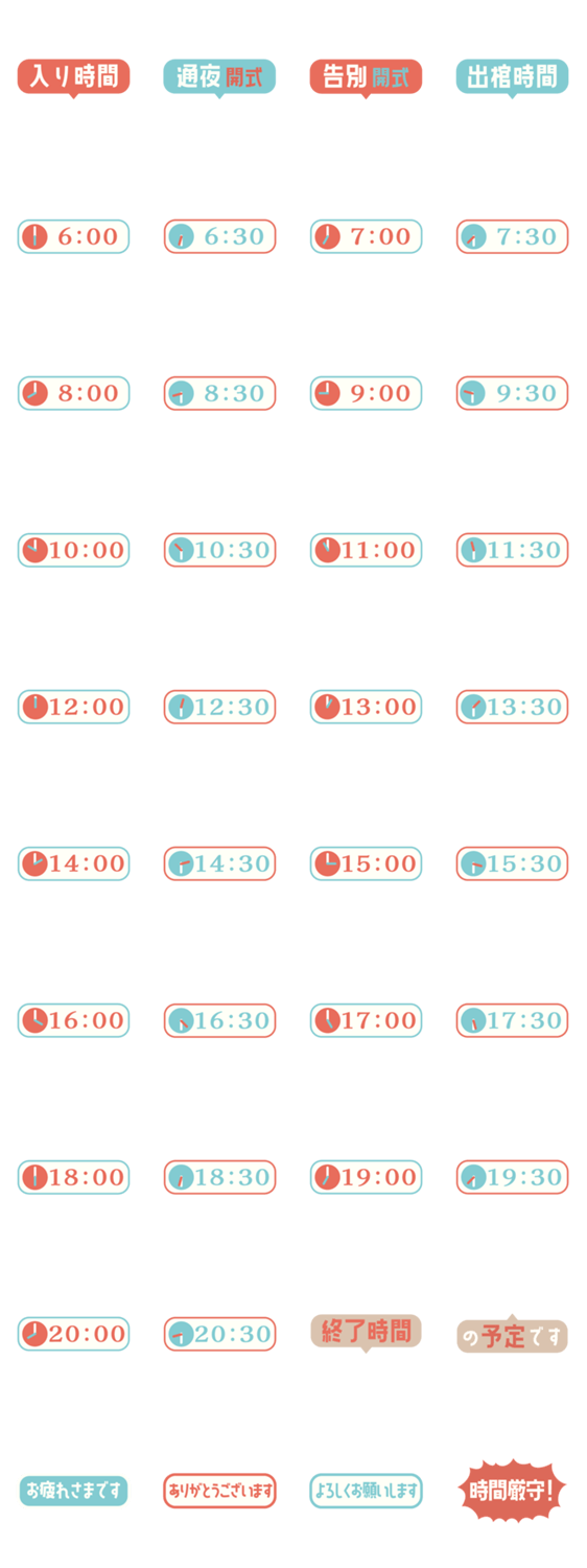 葬儀屋さん専用スタンプです。入り時間、開式時間、出棺時間のお知らせが簡単できます。司会者や葬儀関連の方にもおすすめです。 /時間/葬儀/通夜/告別/入り時間