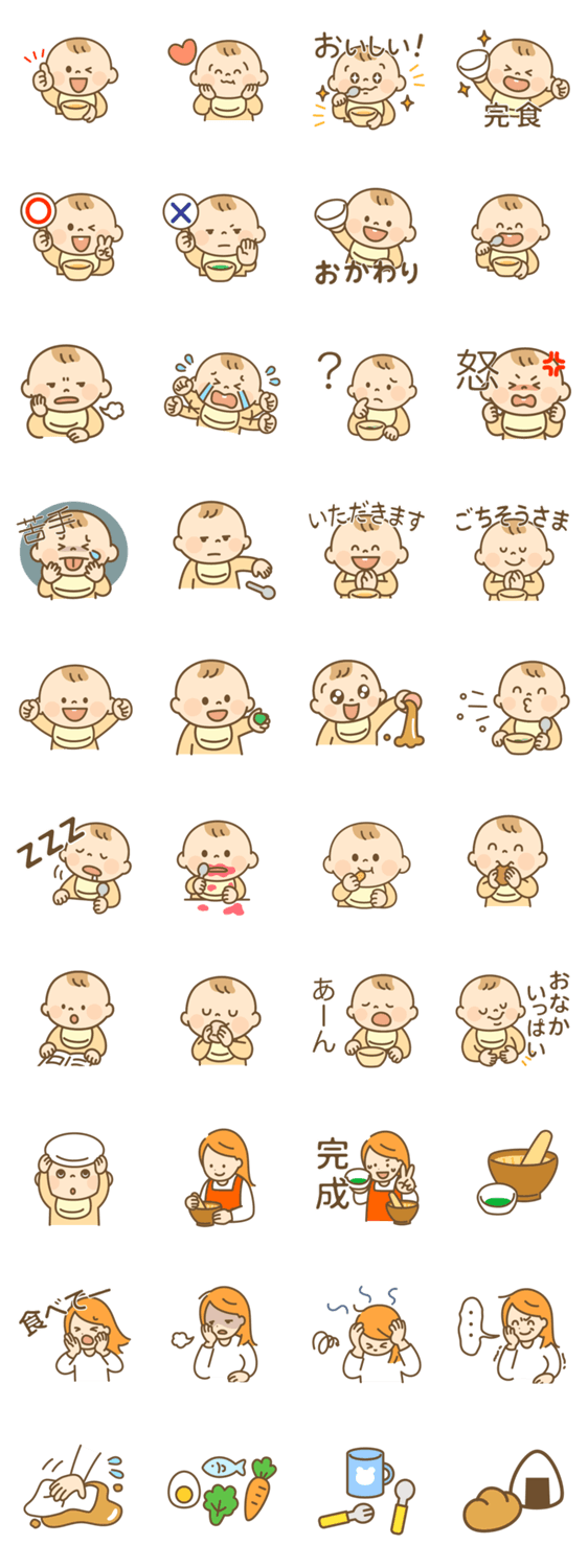 「おいしい!」「ごちそうさま」「食べてくれ〜」など 離乳食の日常がぎゅっと詰まったスタンプです。 ママ友・パパ友とのやりとりにもぴったり!