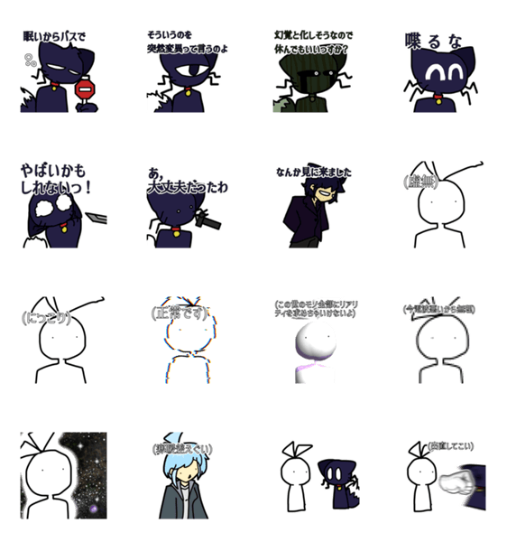 クロネコのラックと白玉みたいなワトが微妙に使えそうで使えないような事を言ってるスタンプです