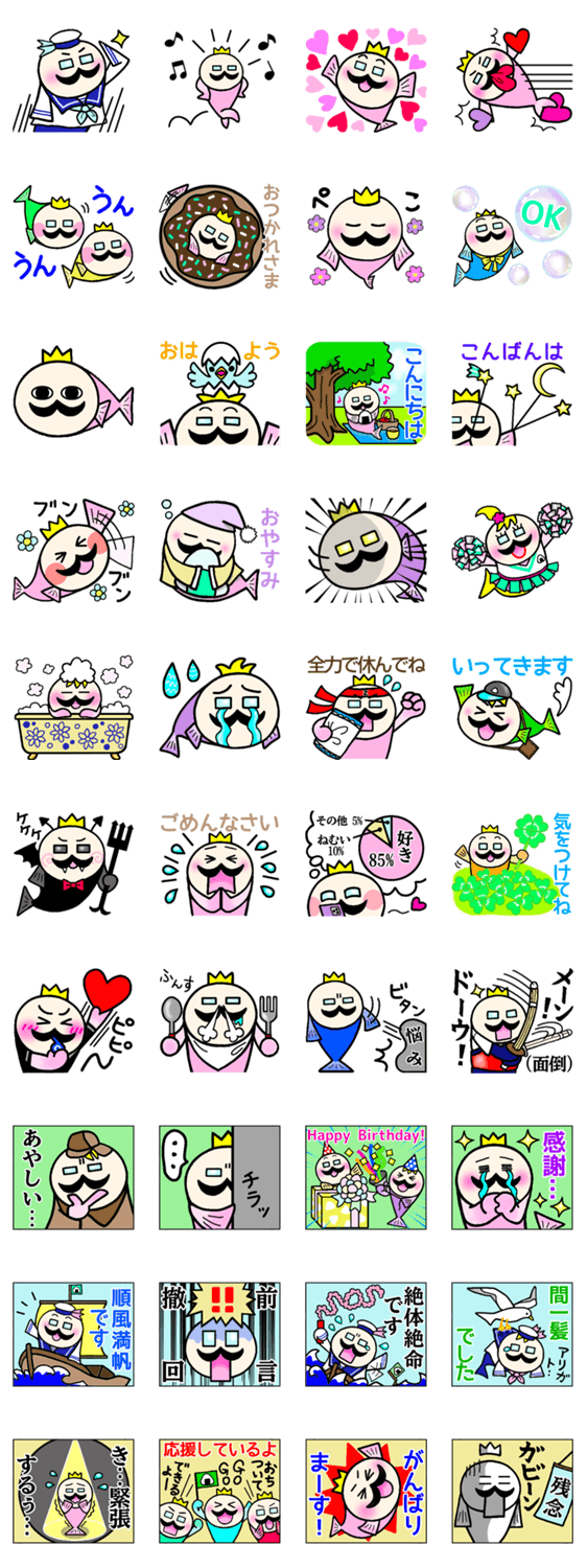 面白可愛い不思議な魚・ヒゲうおスタンプ第4弾が登場! 基本+思わず使いたくなるスタンプがたくさん☆ 今回も4コマ漫画風スタンプのおまけ付きです♪