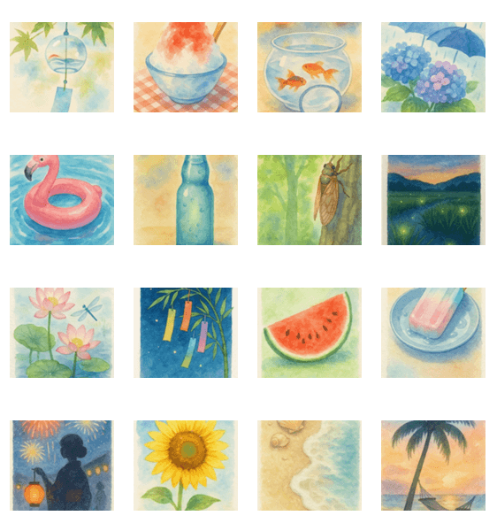 透き通る空に風鈴が揺れ、ひまわり・金魚・ラムネ・花火・かき氷など水彩で描きました。眺めるだけで夏の涼感を感じます。