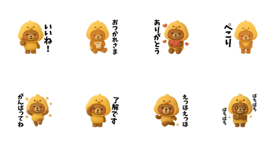 ひよこのかぶりものをかぶった「ひよこぐま」が、「ありがとう」「おつかれさま」など、日常で使う言葉で毎日をやさしく応援します。ほっこりかわいいスタンプです。