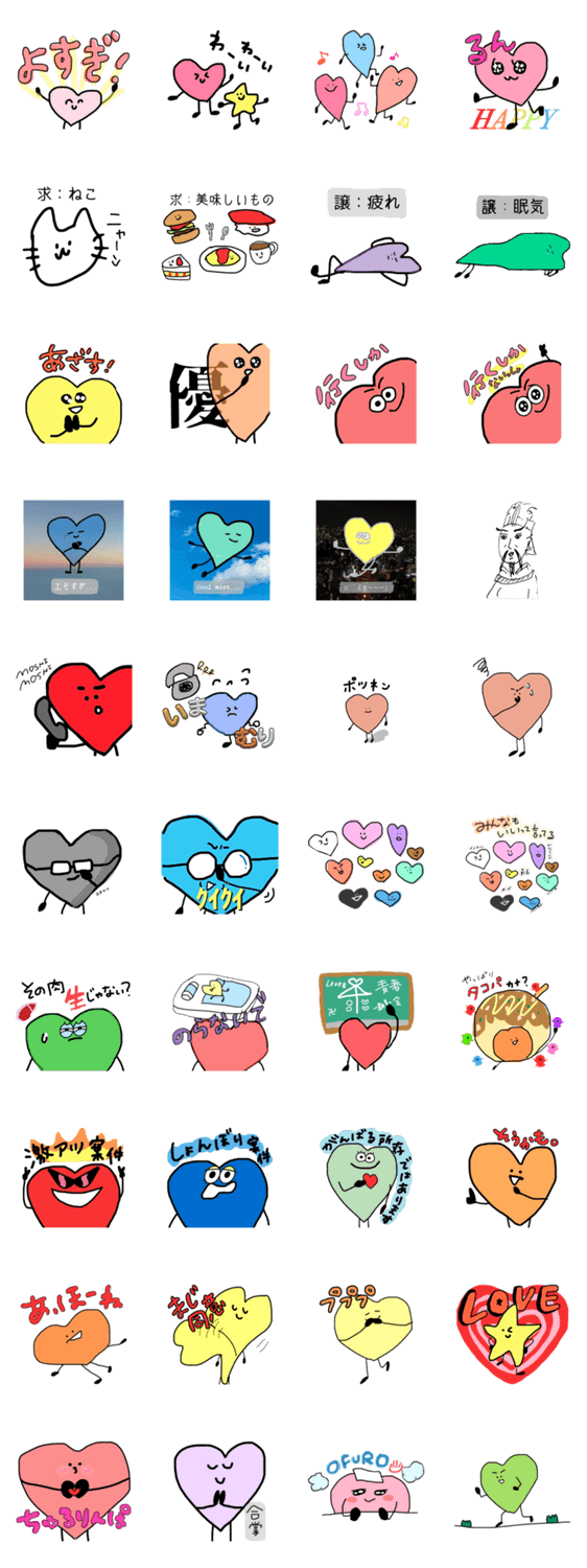 内輪ネタ多めのカラフルハートのスタンプです。始皇帝も入れておきました。
