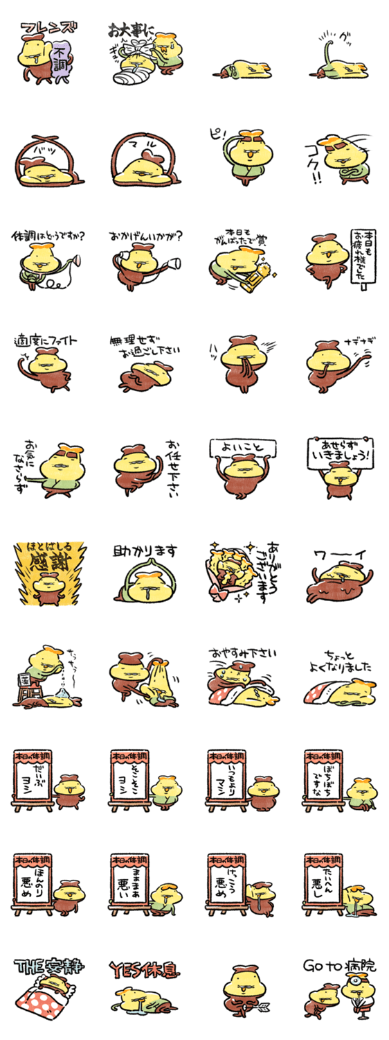 ゆるい天ぷらの忍者と侍の、体の不調にまつわるスタンプです。不調と共に生きている人も、その人に寄り添う人も、ゆるっと日常使いにどうぞ!