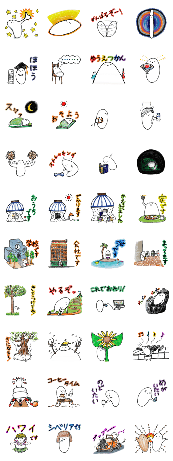 まんまる米つぶさん。第2弾スタンプです。彼の様々な表情をどう読み取るかはあなた次第。そして今回は、米つぶさんがあんなところ、こんなところにも!