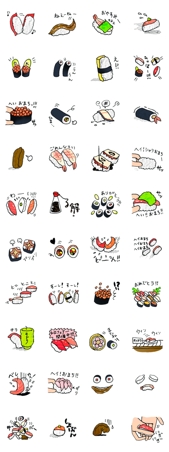 すし屋で人気のマグロやトロ.いくらは勿論、名脇役の卵.あなご.えび.タコまで勢揃い!サーモンが飛ぶ!醤油がたれる!巻寿司が転がる!時には回転!躍動感溢れる寿司スタンプ