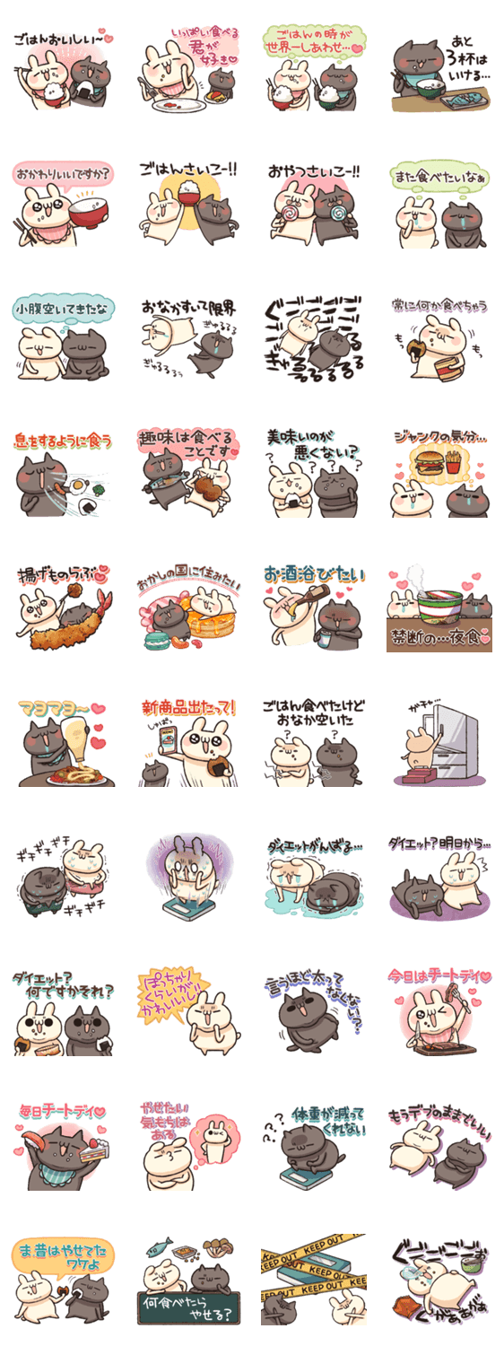 うさぎのしろとねこのくろのスタンプ第三十一弾です。 食べるの大好き、食べるの幸せ!な方々に使ってほしい、ちょっとぽっちゃりスタンプです。