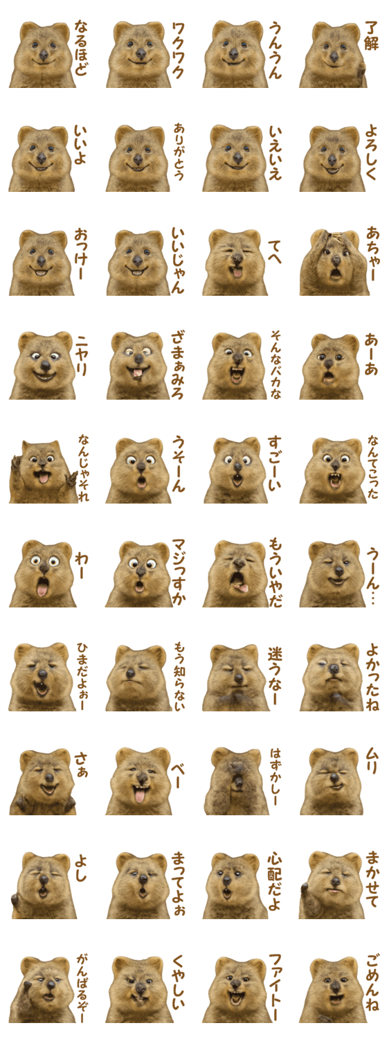 にっこり笑顔で癒される♪ リアルで表情豊かなクオッカたちが、あなたのトークをふんわり明るくしてくれる、無敵の癒し系スタンプです。