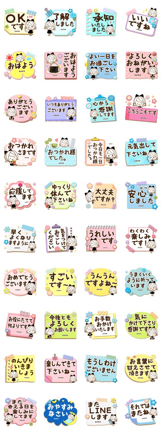 大きな黒いリボンのかわいい女の子の敬語のカスタムスタンプです♪メモの形がかわいくて見やすい♪よく使う言葉を集めました♪♡(名前部分は何度でも編集変更可能です)