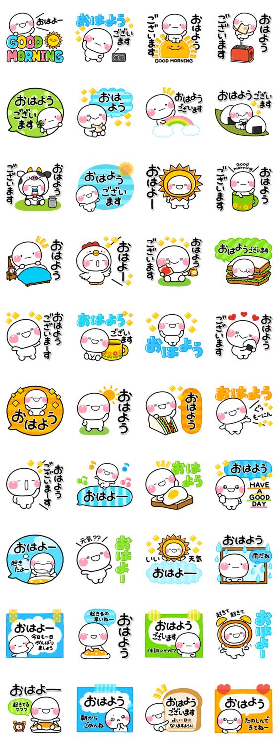 毎日「おはよう」のやり取りしている方におすすめな、全て「おはよう」のみスタンプです。毎日違うスタンプで送れるのでとても便利なセットです。【作:いしいともこ】