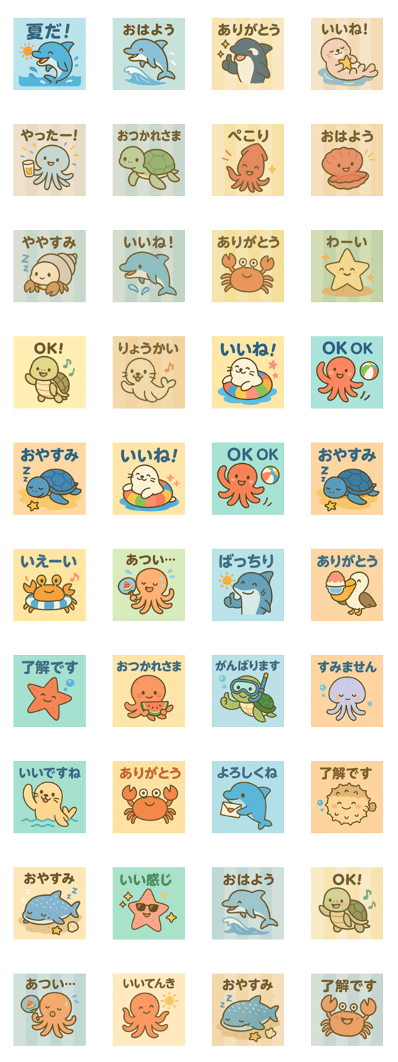 海の生き物が大集合した涼しいスタンプです。毎年の夏にもずっと使える内容を揃えましたのでスタンプ初心者の方にもオススメです。