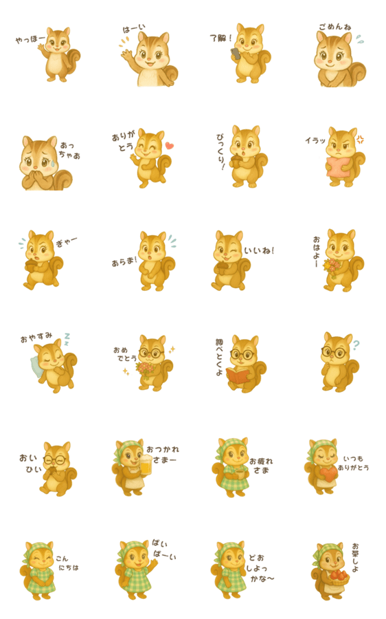 キュートで乙女なリスの水彩画風スタンプです。「はーい、了解!、ごめんね、ありがとう、おはよー、お疲れさま、こんにちは、ばいばーい、おやすみ、イラッ」など。