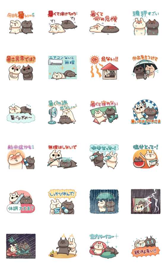 うさぎのしろとねこのくろの動くスタンプ第5弾です!今年の猛暑にぴったり!