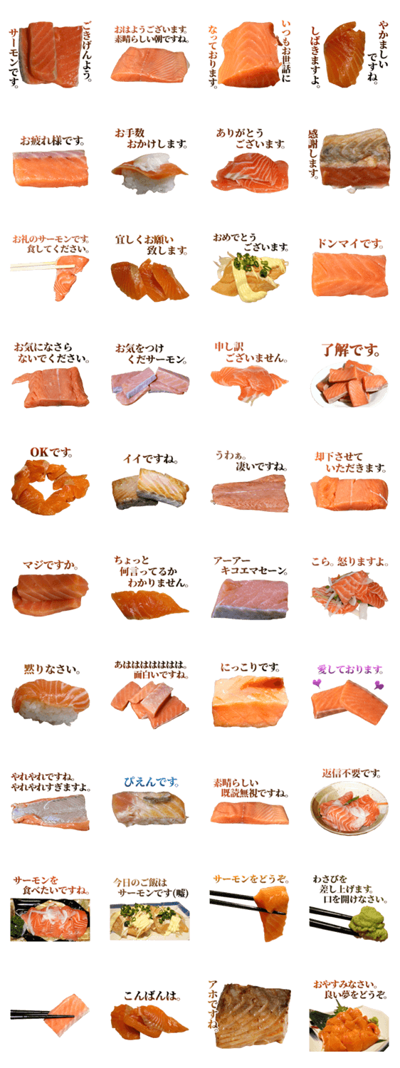 敬語を使う、毎日使えるサーモンのスタンプです。敬語はお寿司におけるサーモン。丁寧語、アトランティック、トロサーモン、さーもん、鮭、実写食べ物スタンプシリーズ。