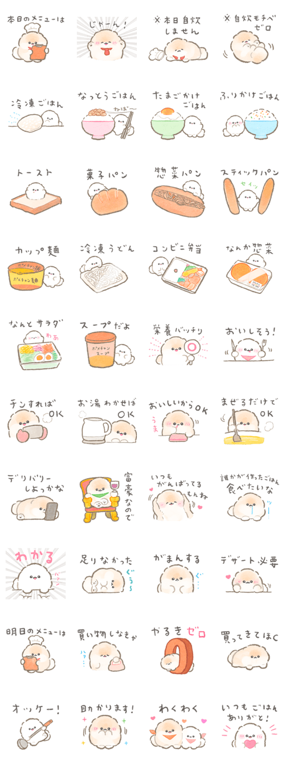 ごはん作りたくない!そんな日にぴったりのスタンプです。パンや惣菜・冷凍うどん・カップ麺など、共感まちがいなしのスタンプでゆるく乗り切ろう!