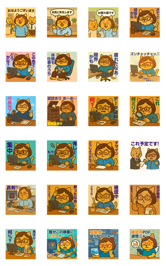 DTPオペレーターの日常会話を詰め込んだ実用スタンプ! 頼れるチビデブ中年女性「チビタンク猫」が、今日も現場で大奮闘! 同業者とのやり取りに最適!