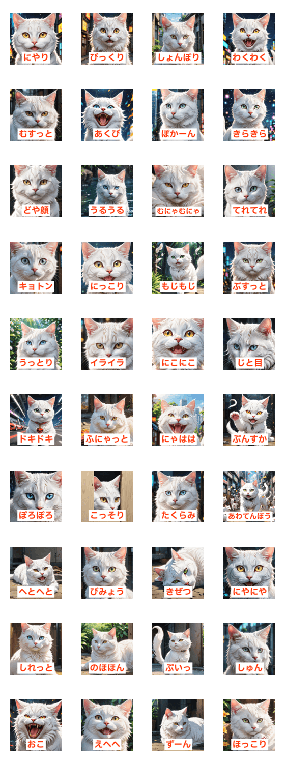 にやり、しょんぼり、ぷんすか…白猫があなたの気持ちを代弁!日常にぴったりの感情スタンプです。