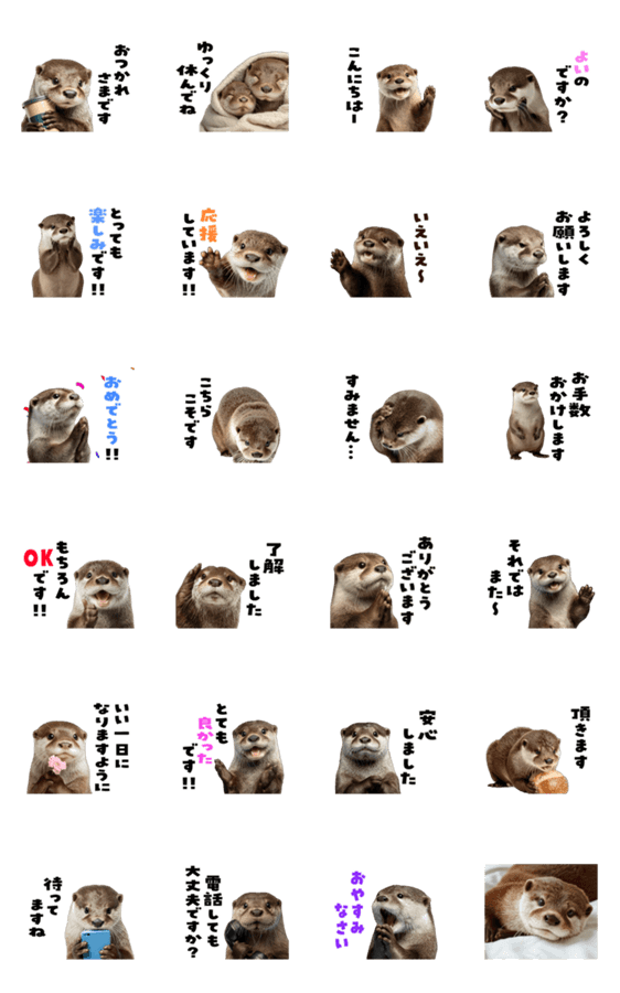 いっぱい動くカワウソのアニメーションスタンプ。便利で使える敬語が豊富で一年中友達同僚に使えます。 かわうそ/コツメ/イタチ/うごく/動画/映像/透過/挨拶/けいご/リアル