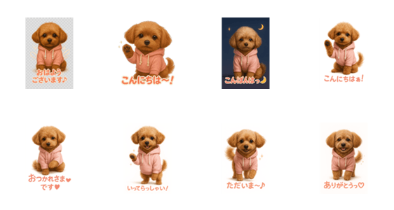 のあ店長が、ふんわり優しくごあいさつ。 毎日使える「おはよう」「ありがとう」「おつかれさま」など、癒し系チワプーのスタンプです♪